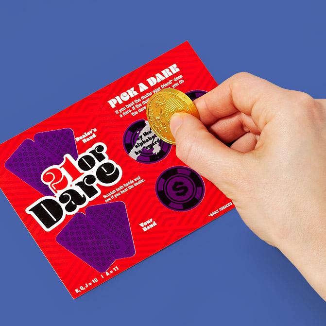 Pair a silver or gold scratch layer with a full color card and you have our classic scratch off.